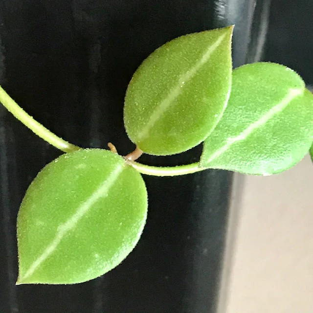 Petite, medium green, heart-shaped leaves, measuring 1cm x 1cm, with slight reddish margins in high levels of sunlight.