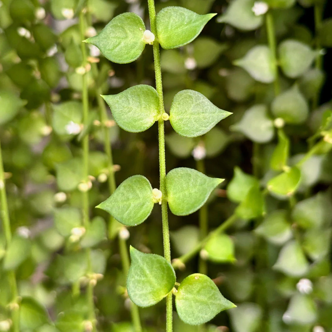 Slender green stems that grow up to 1m in length, densely decorated with pairs of firm and succulent heart-shaped leaves.