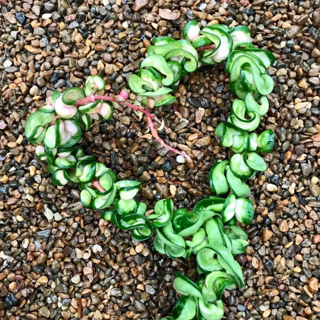 Draping succulent vine with thick, twisted, curly, cupped, leaves which are pale green/ yellow in centre with a darker green leaf margin.