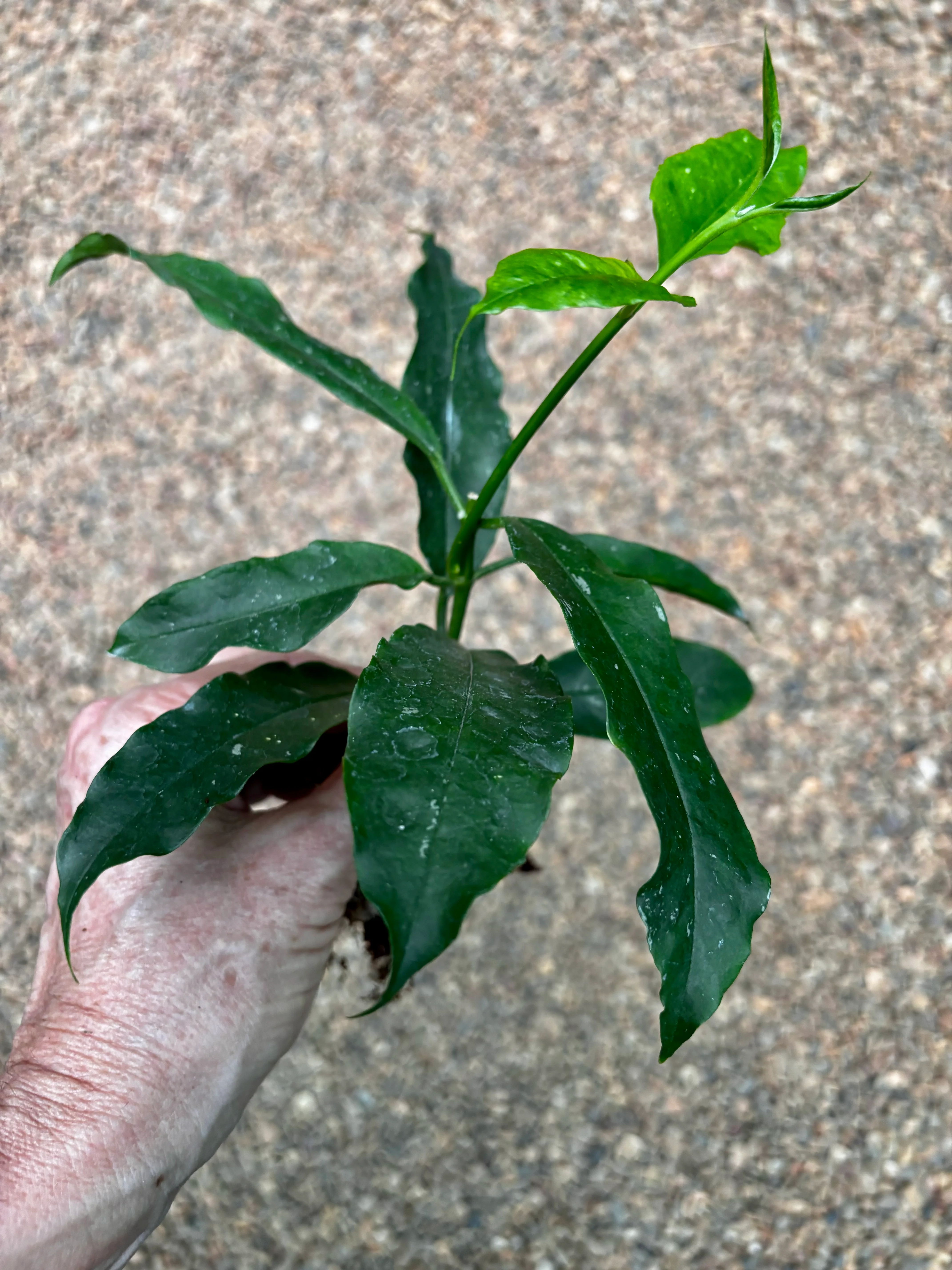 Smooth leaves in dark green with ruffled edges, measuring up to 15cm x 4cm, with small amounts of splash. Easy to grow. A very pretty hoya.