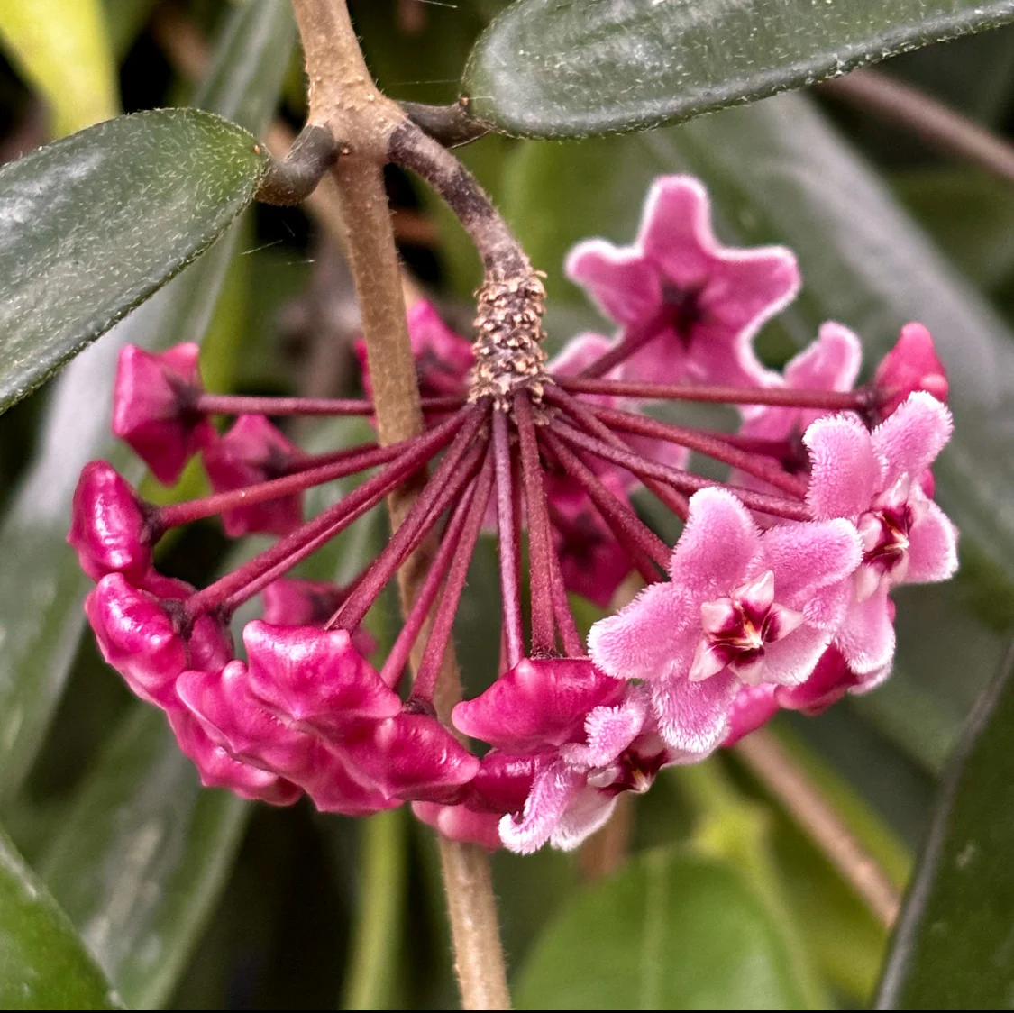 Blooms: Light to dark pink star-shaped flowers, up to 20mm across, with red-centred white corona. Up to 20 flowers per umbel. Pleasing fragrance though not strong. Flowers last for up to 7 days.