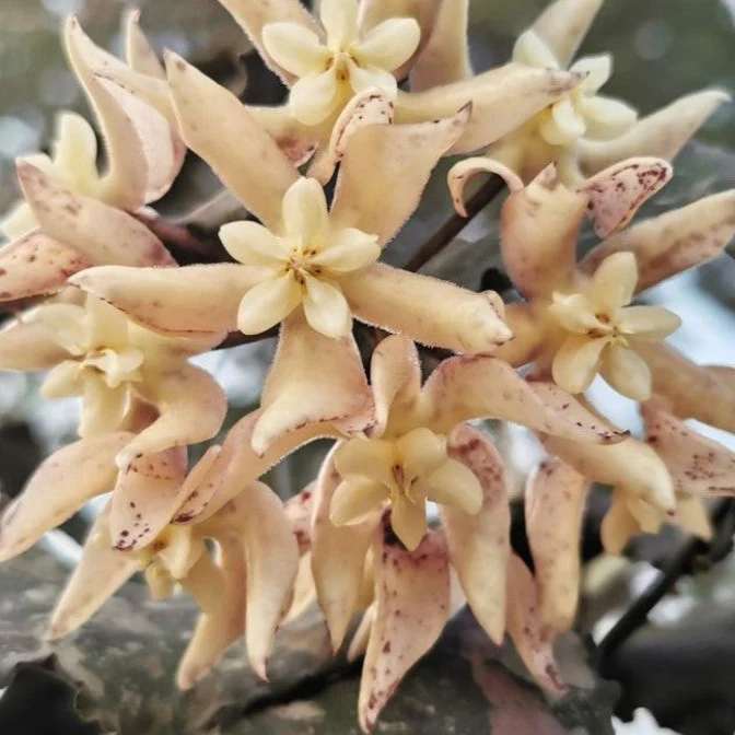 Blooms: Star shaped flowers, buff in colour, with smatterings of burgundy on the petal’s outer side, measuring 25mm, with matching buff corona. Up to 8 flowers per umbel. Sweet fragrance. Flowers last up to 3 days.